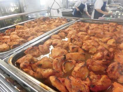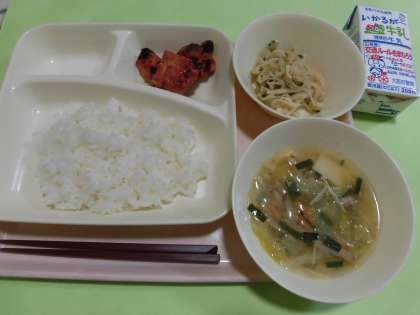 ・鶏肉のチリソース焼き ・焼き豚とワンタンの皮のスープ ・切干しだいこんのごま辛みづけ ・ごはん ・牛乳 です。