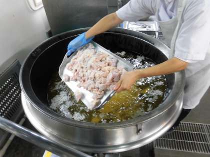 衣をつけて油で揚げた鶏肉に、白ねぎが入ったたれをからませています。ごま油がきいた、おいしいたれです。