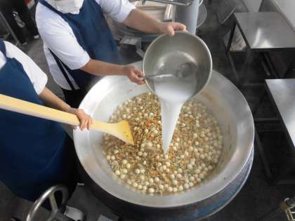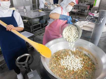 具だくさんの丼です。アレルギーのある人には、うずら卵を入れる前に取り除いて渡します。仕上げに水どきでんぷんでとろみをつけています。
