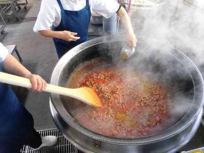 ウインナー、ベーコン、たまねぎ、ピーマンをいためてケチャップやカレー粉などで味つけした具を、ごはんに混ぜて食べます。