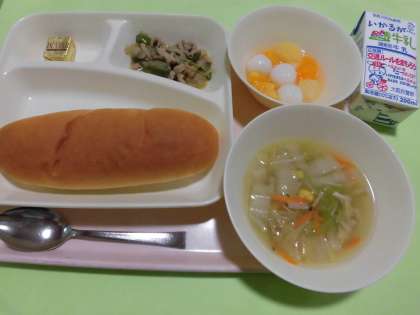 ・豚肉と野菜のソテー ・はくさいのスープ ・フルーツ白玉 ・コッペパン ・バター ・牛乳 です。