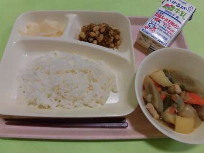 ・鶏肉とやさいの煮もの ・じゃこ豆 ・かぶのゆず風味 ・ごはん ・牛乳 です。