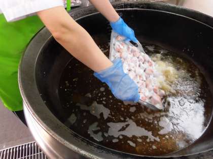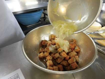 たまねぎをオリーブ油でいため、砂糖、米酢、オリーブ油などで味つけしたマリネ液を、揚げたさけにからませています。