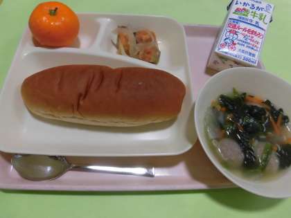 ・さけのマリネ ・肉だんごと麦のスープ ・みかん ・黒糖パン ・牛乳 です。