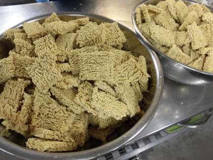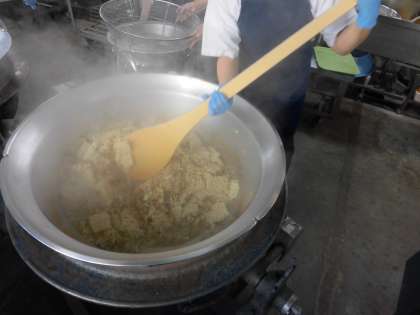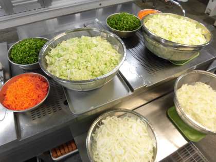 塩、こしょう、うすくちしょうゆ、こいくちしょうゆで味つけをした焼きそばです。かつおぶしをかけて食べます。今日は、全員分の焼きそばを2つの釜で作っています。