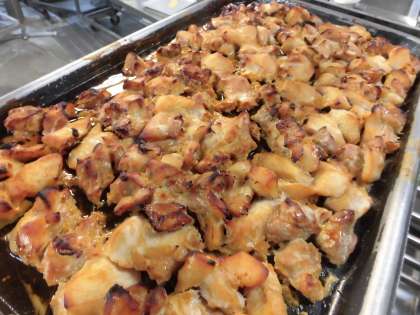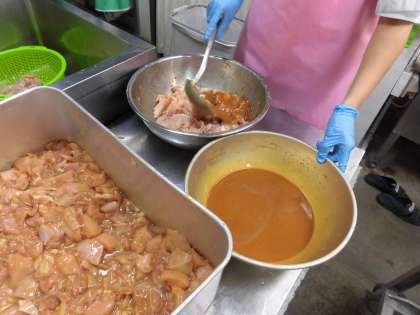 鶏肉に、砂糖、しょうゆ、みそなどで下味をつけて、焼き物機で焼いています。甘辛い味つけで、ごはんが進みます。
