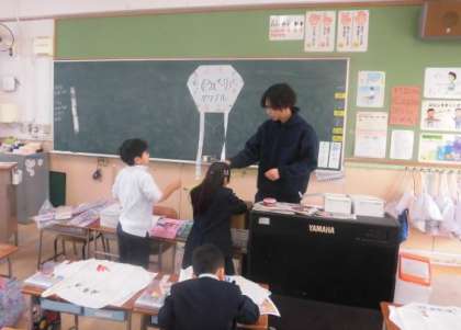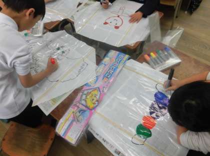 1年生は、図画工作で昔遊びの「たこあげづくり」の学習をしました。ビニルだこに「おおきくえをかく」ことをめあてにしました。子どもたちは、色マジックを使って、自分たちが考えた絵や模様を描きました。個性あふれた絵や模様がいっぱいでした。完成したたこが空に上がるのが楽しみです。