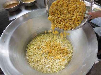 煮くずれるまでやわらかく煮たさつまいもに、くりを入れて、甘く煮含めています。