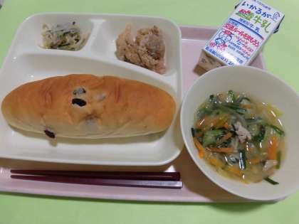 ・鶏肉のからあげ ・中華スープ ・チンゲンサイともやしの甘酢あえ ・レーズンパン ・牛乳 です。