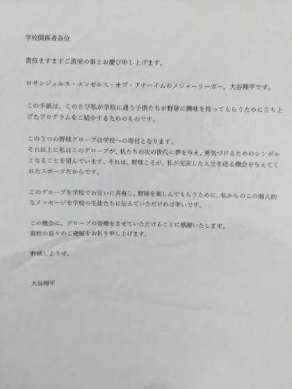 児童・保護者のみなさまもニュース等でお知りいただいていることかと思いますが、大谷選手のグローブ3つがようやく北巽小学校にも届きました。