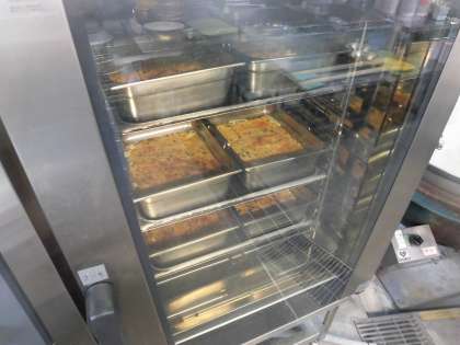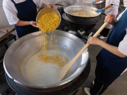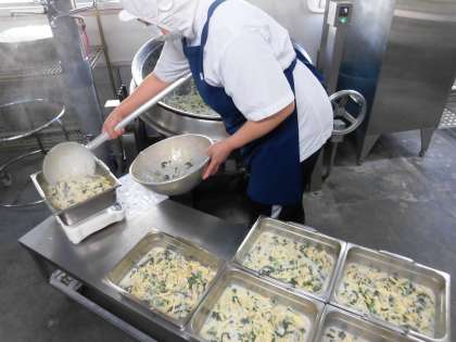 ほたて貝のうまみがたっぷりのグラタンです。釜で炒めて作った具をミニバットに入れて、パン粉と粉末チーズをふって、焼き物機で焼いています。こんがりとした焼き目がとてもおいしそうですね。