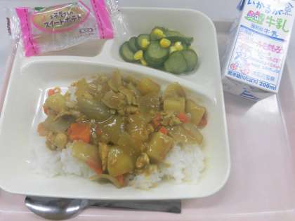 ・チキンレバーカレーライス ・きゅうりとコーンのサラダ ・スイートポテト ・牛乳 です。