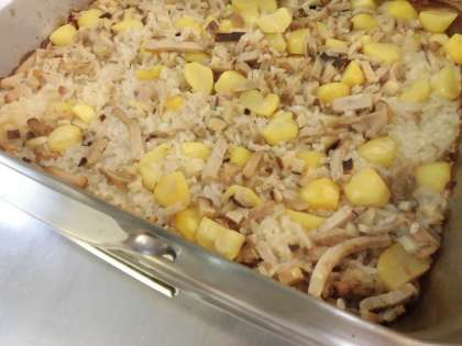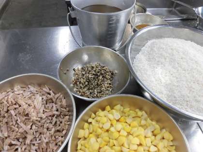 もち米と焼き豚、くり、しいたけ、調味液をミニバットに入れて、焼き物機で蒸し焼きにしています。モチモチとして、旨みもあり、とても人気がある献立です。