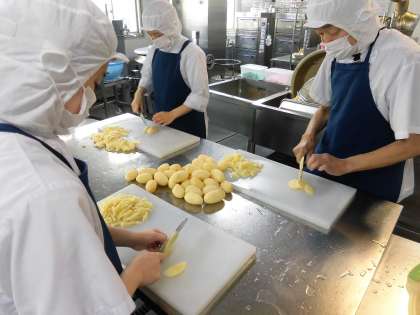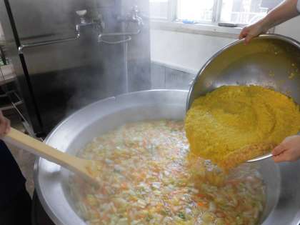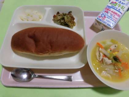 ・豚肉のカレー風味焼き ・コーンとはくさいのスープ ・カリフラワーのレモンドレッシング ・黒糖パン ・牛乳  です。