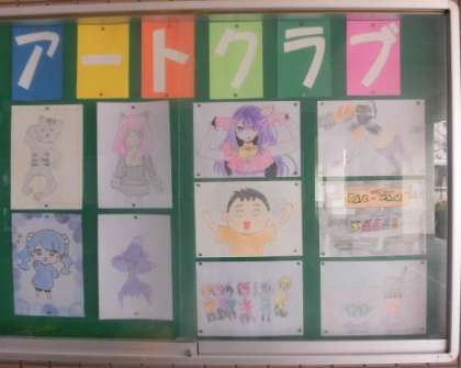 玄関ロビーにある掲示板に、クラブ活動の内容や作品が掲示されています。