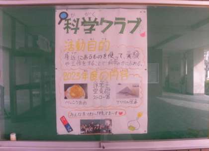 アートクラブは、「イラスト作品」が掲示されていました。科学クラブは、「活動の目的:身近にあるものを使って、実験や工作をすることで科学の力にふれる。」や活動の内容を紹介していました。