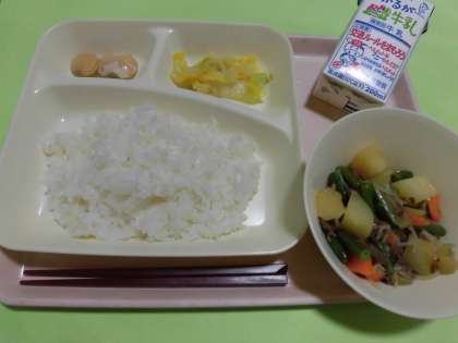 ・肉じゃが ・はくさいのゆず風味 ・白花豆の煮もの ・ごはん ・牛乳  です。