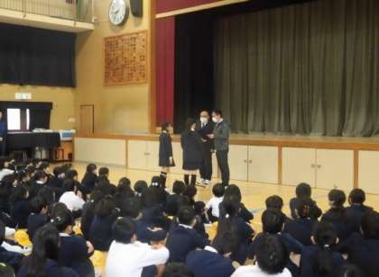 北巽小学校5年生2人は、自由作文部門に挑戦しました。この部門は、自分で作文を書いて、それを韓国朝鮮語で話すというものです。難しい挑戦でしたが、2人とも「奨励賞」を受賞しました。児童朝会で、表彰しました。
