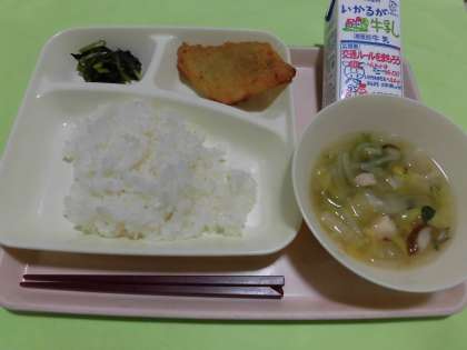 ・たらフライ ・うすくず汁 ・ほうれんそうのおひたし ・ごはん ・牛乳 です。