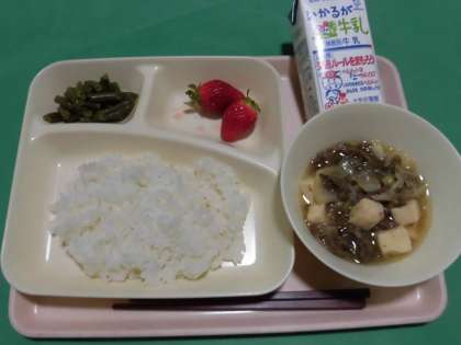 ・すき焼き煮 ・さんどまめのごまあえ ・いちご ・ごはん ・牛乳 です。