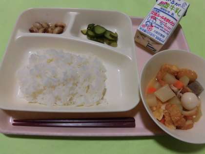・関東煮 ・きゅうりの梅風味 ・とら豆の煮もの ・ごはん ・牛乳 です。