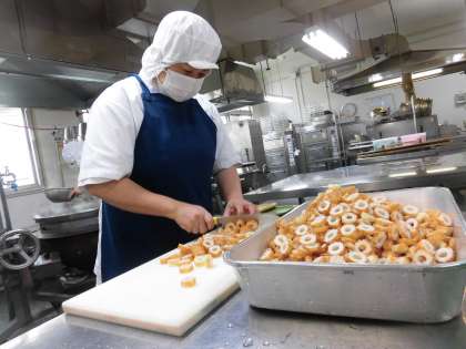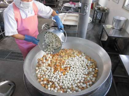 「関東煮」には、うずら卵やこんにゃくが入っています。しっかりかんで食べましょう。卵アレルギーのある人には、うずら卵を入れる前に取ったものを渡します。
