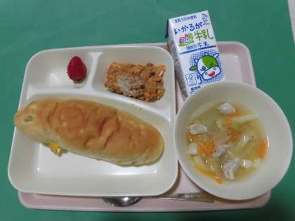 ・とうふのミートグラタン ・じゃがいもと野菜のスープ ・いちご ・おさつパン ・牛乳  です。