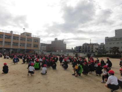 先生が鬼になって、白帽子の児童のみんなが逃げました。児童たちは、鬼にタッチされたら帽子を赤に変えて鬼になります。だんだん赤帽子をかぶった鬼がふえていきました。最後は、ほとんどの児童の帽子が赤色に代わってしまいました。