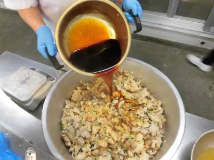 鶏肉にしょうが汁で下味をつけて、白ねぎと混ぜ合わせて焼き、焼きあがってから甘辛いたれをかけています。