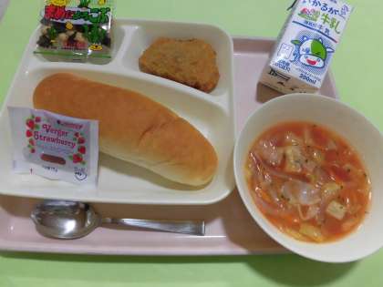 ・一口トンカツ ・ミネストローネ ・豆こんぶ ・コッペパン ・いちごジャム ・牛乳  です。
