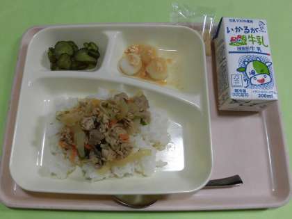 ・豚丼 ・きゅうりの梅風味 ・白玉だんご【きな粉】 ・牛乳  です。
