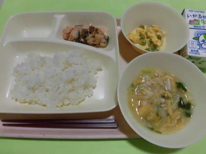 ・さけのごまみそ焼き ・五目汁 ・えんどうの卵とじ ・ごはん ・牛乳 です。