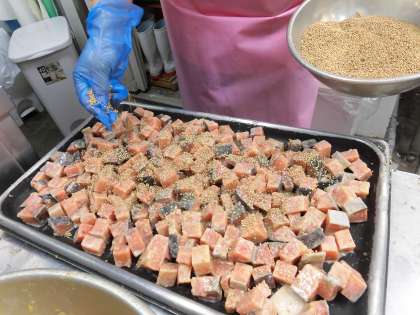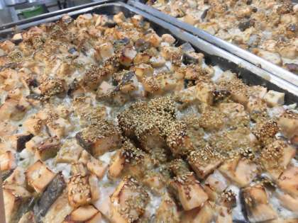 さけは、ねりごま、さとう、うすくちしょうゆ、白みそで下味をつけて、いりごまをふって焼いています。