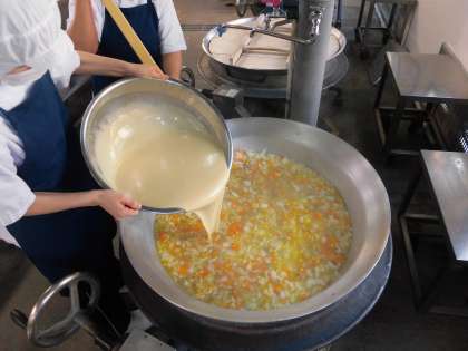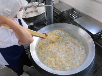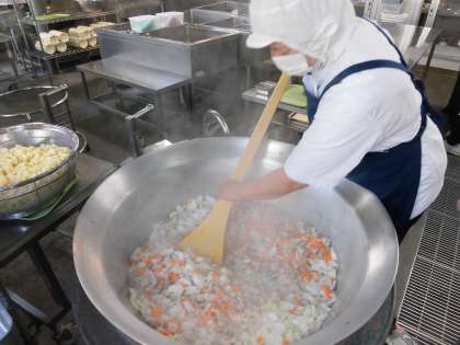 今年度から、シチューのルウは、新食品の「シチュールウの素」を使っています。小麦粉や乳製品が入っていないため、小麦アレルギー、乳アレルギーのある人も食べることができるシチューです。