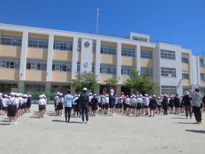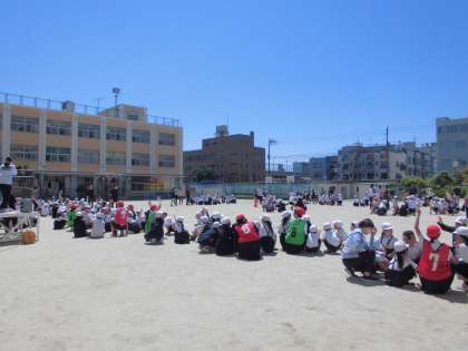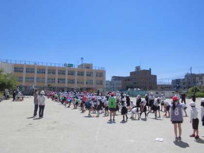 今日2時間目に、運動場であおぞら班集会の隊形に初めて並びました。