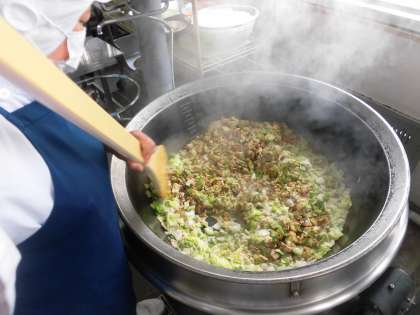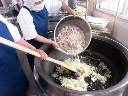 給食では、豚ばら肉をゆでてから、他の材料と一緒にいためています。