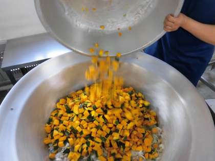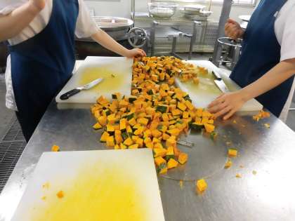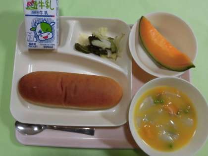 ・鶏肉とかぼちゃのシチュー ・ミックス海そうのサラダ ・クインシーメロン ・黒糖パン ・牛乳  です。
