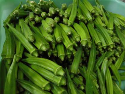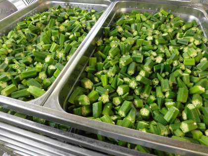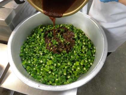 焼き物機で蒸したオクラに、かつおぶしと梅肉の風味がきいた調味液をかけてあえています。