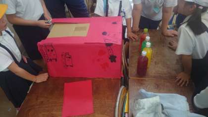 赤い箱の中に、色水入りのペットボトルを並べています。班で協力して、箱の中の色の順に手っとボトルを並べます。ヒントを聞いてチャレンジ!