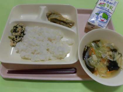 ・いわしてんぷら ・五目汁 ・とりなっ葉いため ・ごはん ・牛乳 です。