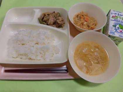 ・豚肉のごまみそ焼き ・すまし汁 ・切干しだいこんのいため煮 ・ごはん ・牛乳 です。