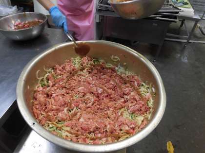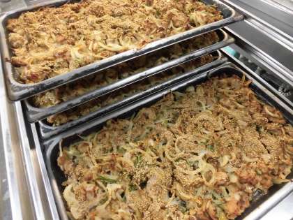 「豚肉のごまみそ焼き」は、豚肉とたまねぎ、ピーマンを混ぜ合わせて焼いています。