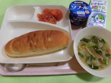 ・えびのチリソース ・中華スープ ・ヨーグルト ・おさつパン ・牛乳 です。