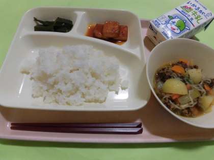 ・肉じゃが ・あつあげのみそだれかけ ・オクラのおかかいため ・ごはん ・牛乳 です。