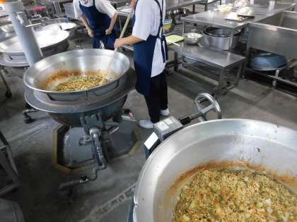 北巽小学校の焼きそばは、大きな釜2つに分けて作っています。