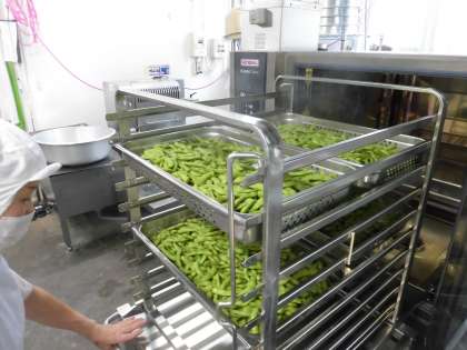 「えだまめ」は、焼き物機で蒸しています。蒸すことで、えだまめの甘みをとても感じられます。