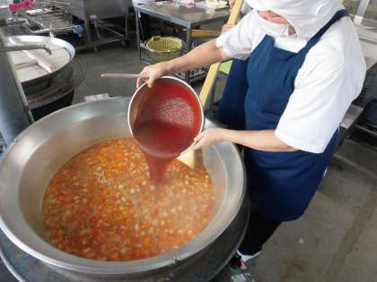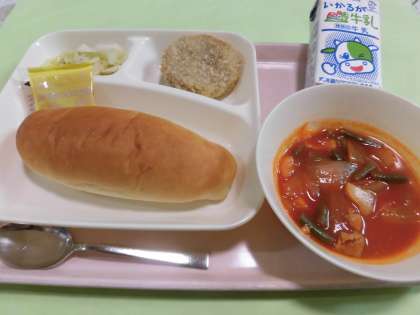 ・チキンレバーカツ ・ケチャップ煮 ・キャベツのバジル風味サラダ ・コッペパン ・アプリコットジャム ・牛乳 です。