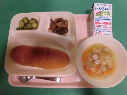 ・牛肉のソース煮 ・スープ ・きゅうりのピクルス ・黒糖パン ・牛乳 です。