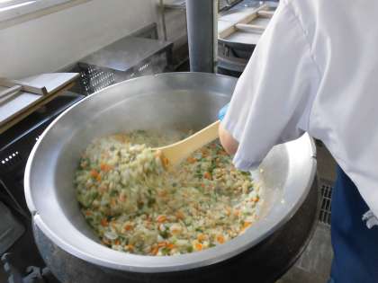 今日の給食では、たまねぎ、たけのこ、にんじん、ピーマンを使っています。