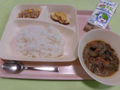 ・マーボーなす ・ツナと野菜のいためもの ・焼きさつまいもの甘みつかけ ・ごはん ・牛乳  です。